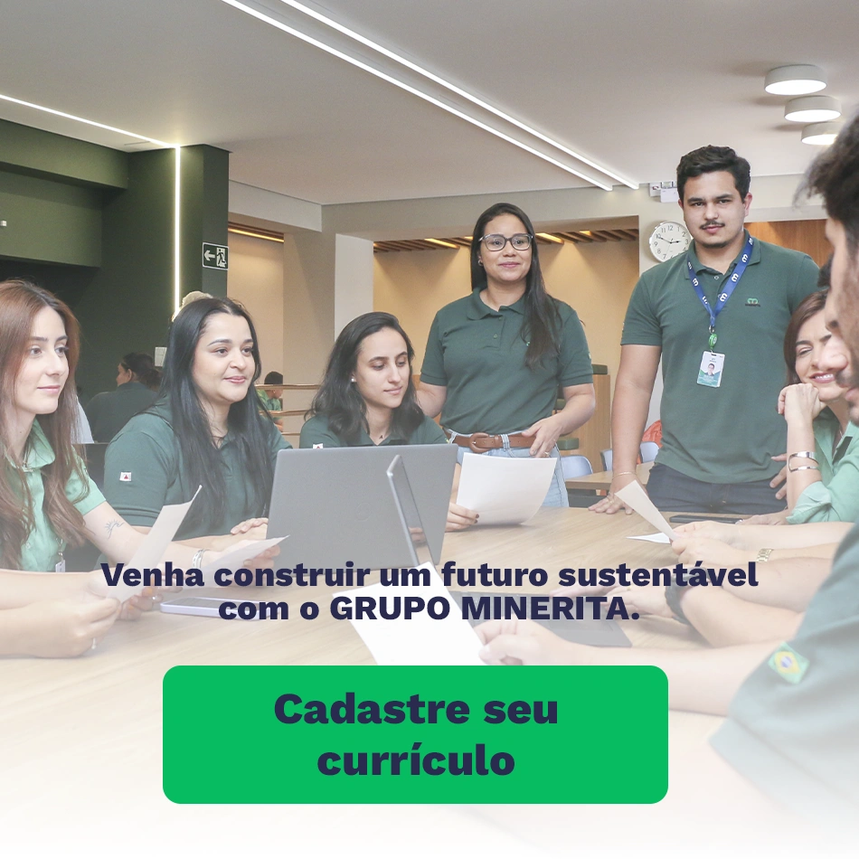 Esse é o primeiro passo para iniciar sua jornada com a gente! Através do cadastro do seu currículo em uma vaga ou no nosso banco de talentos, poderemos conhecer seu perfil, suas experiências e habilidades e assim avaliar se há conexão com a vaga. Esse é o momento de mostrar quem você é e o que te conecta com o Grupo Minerita.